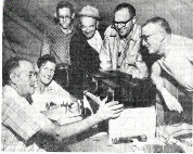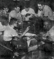 Ken Becker adjusts the transmitter to the 15-meter band during a 24-hour nationwide drill of emergency communications, which was held over the weekend in conjunction with the American Radio Relay League. Members of the St. Clair County Amateur Radio Club set up their equipment under simulated emergency conditions at American Legion's Freedom Farm on Jefferson Road and maintained contact with other radio operators throughout the U.S. and Canada. Observing ken at the controls are, from left: Tony Coleman, Bill Steffel, James Murphy, Don Wittlich, Clem Mudd, president of the St. Clair County Amateur Radio Club, and Edwin Matysick Civil Defense communications officer. (News Paper Photo/Date Unknown)